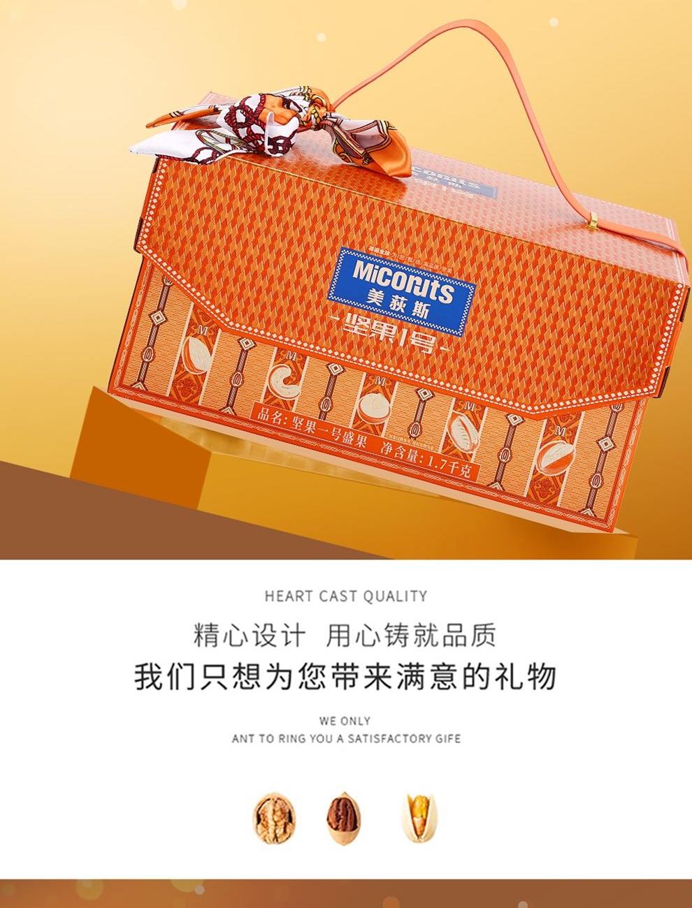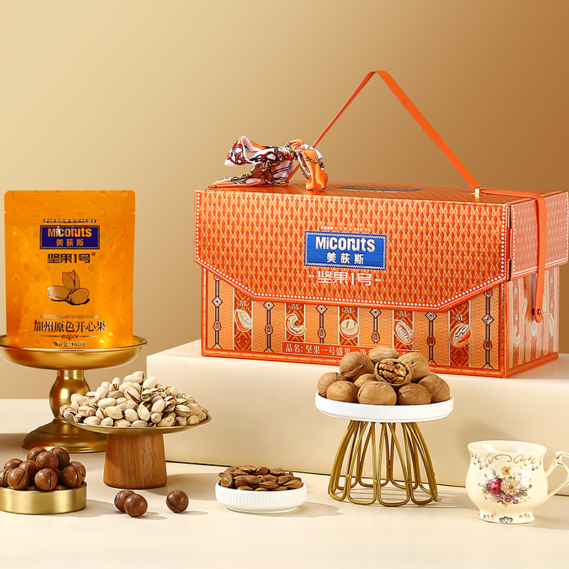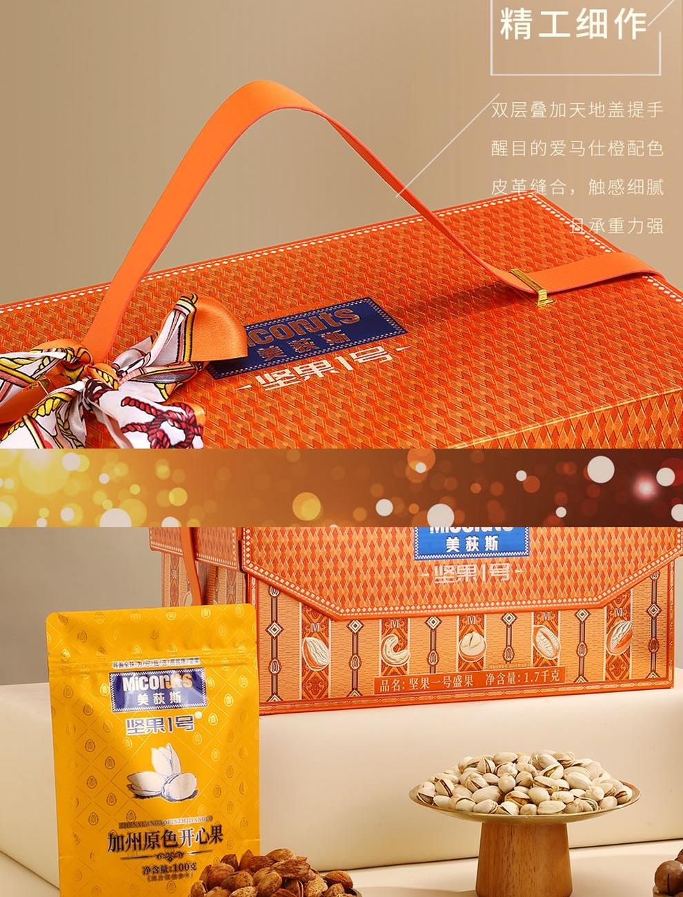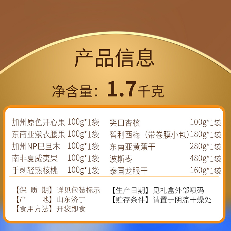 加州原色開心果 100g*1 東南亞紫衣腰果 100g*1 加州NP巴旦木 100g*1 南非夏威夷果 100g*1 手剝輕熟核桃 100g*1 笑口杏核 100g*1 智利西梅 180g*1 東南亞黃蕉干 280g*1 波斯棗 480g*1 泰國龍眼干 160g*1 合計:1700g