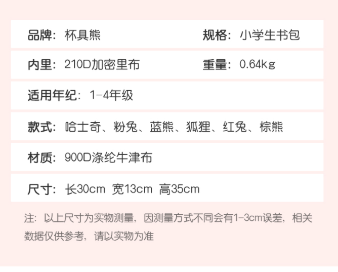 商品名稱:杯具熊皮皮樂園書包 商品毛重:0.78kg 適用性別:通用 材質:牛津布,滌綸(聚酯纖維) 款式:背負式 功能:透氣,超輕 適用階段:幼兒,小學1-3年級 大小:小包,中包 圖案:卡通動漫,動物