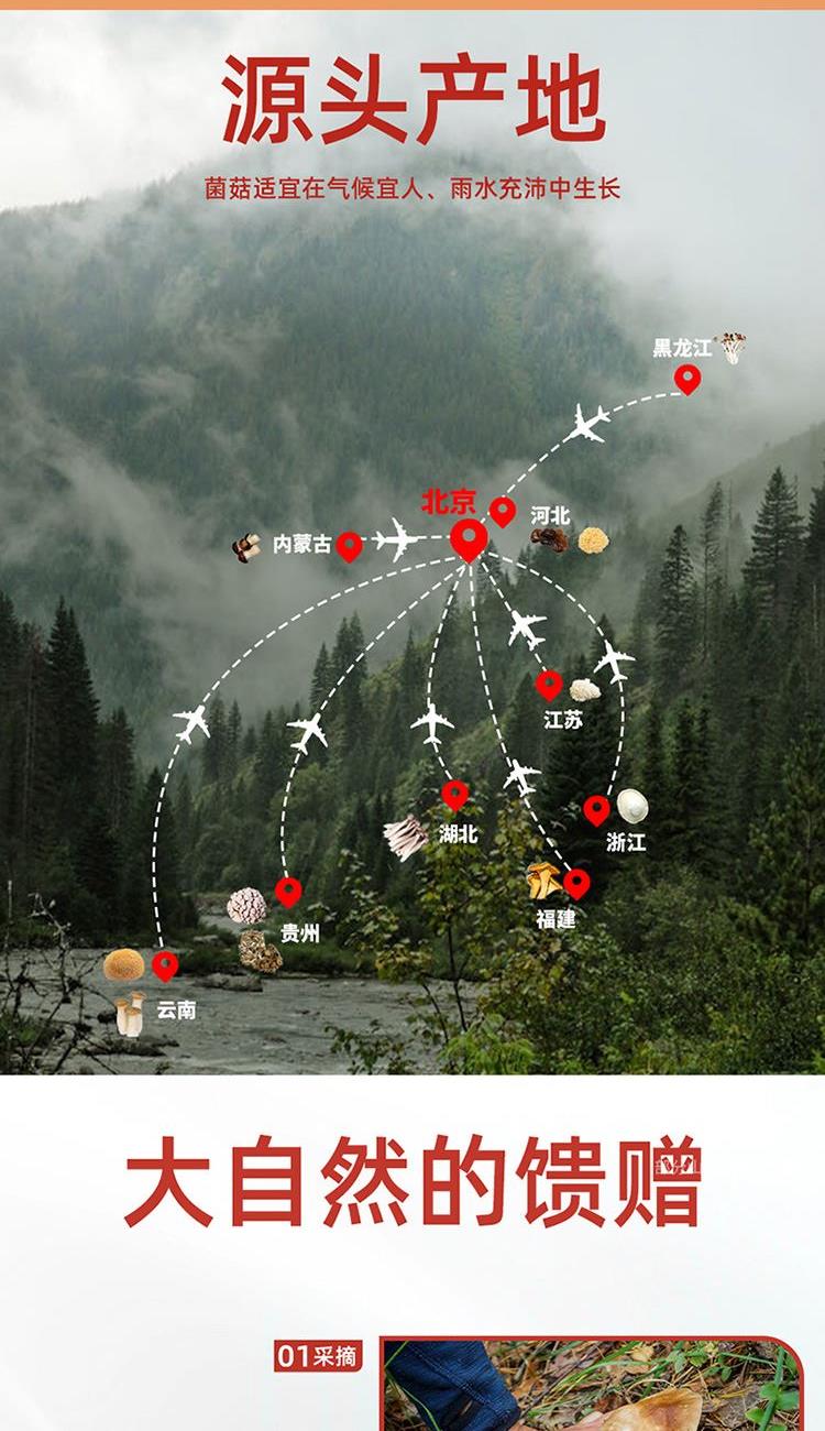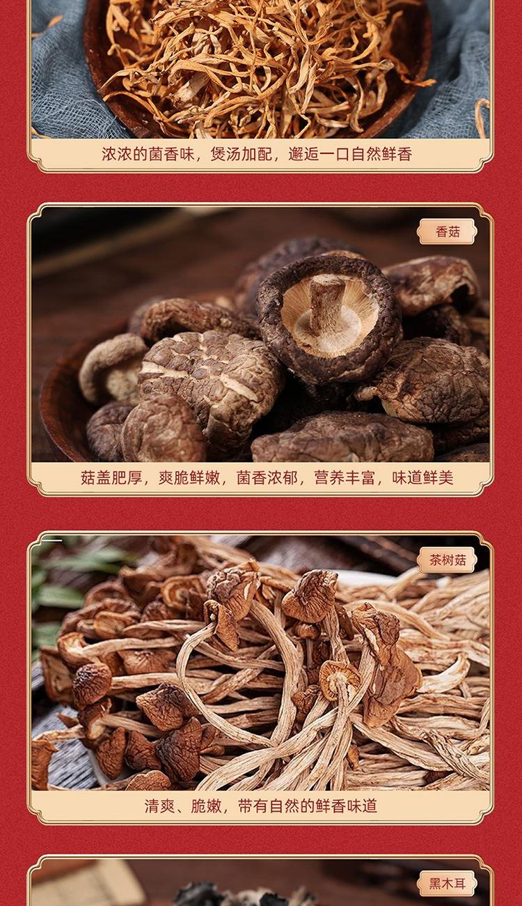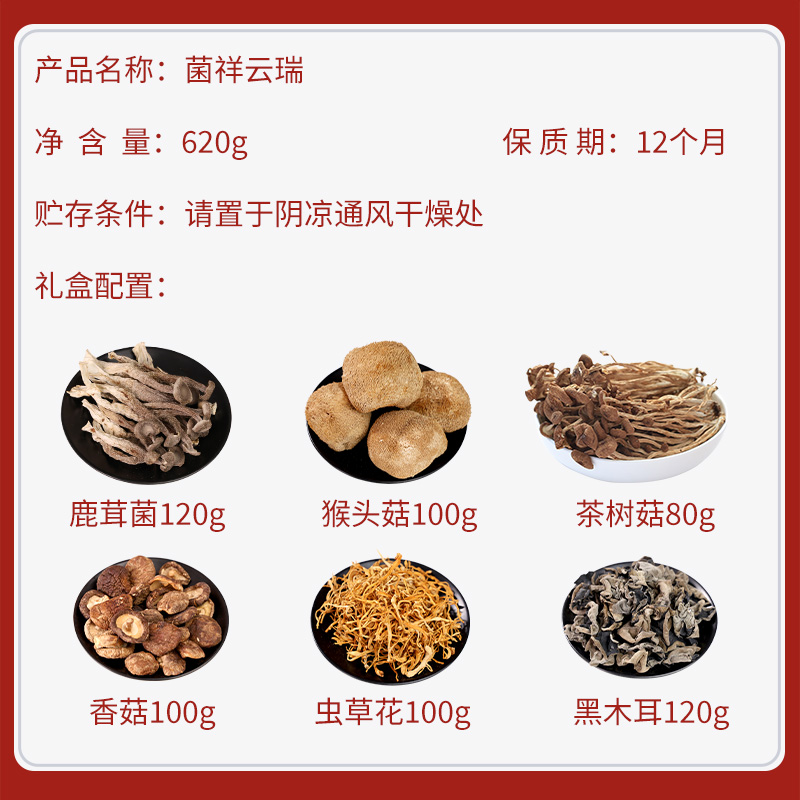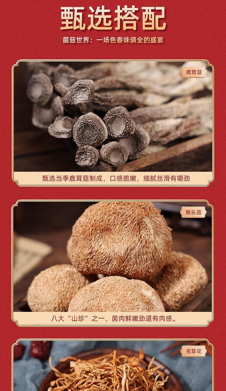 內(nèi)置:茶樹(shù)菇80g 香菇100g 黑木耳120g 蟲(chóng)草花100g 猴頭菇100g 鹿茸菇120g