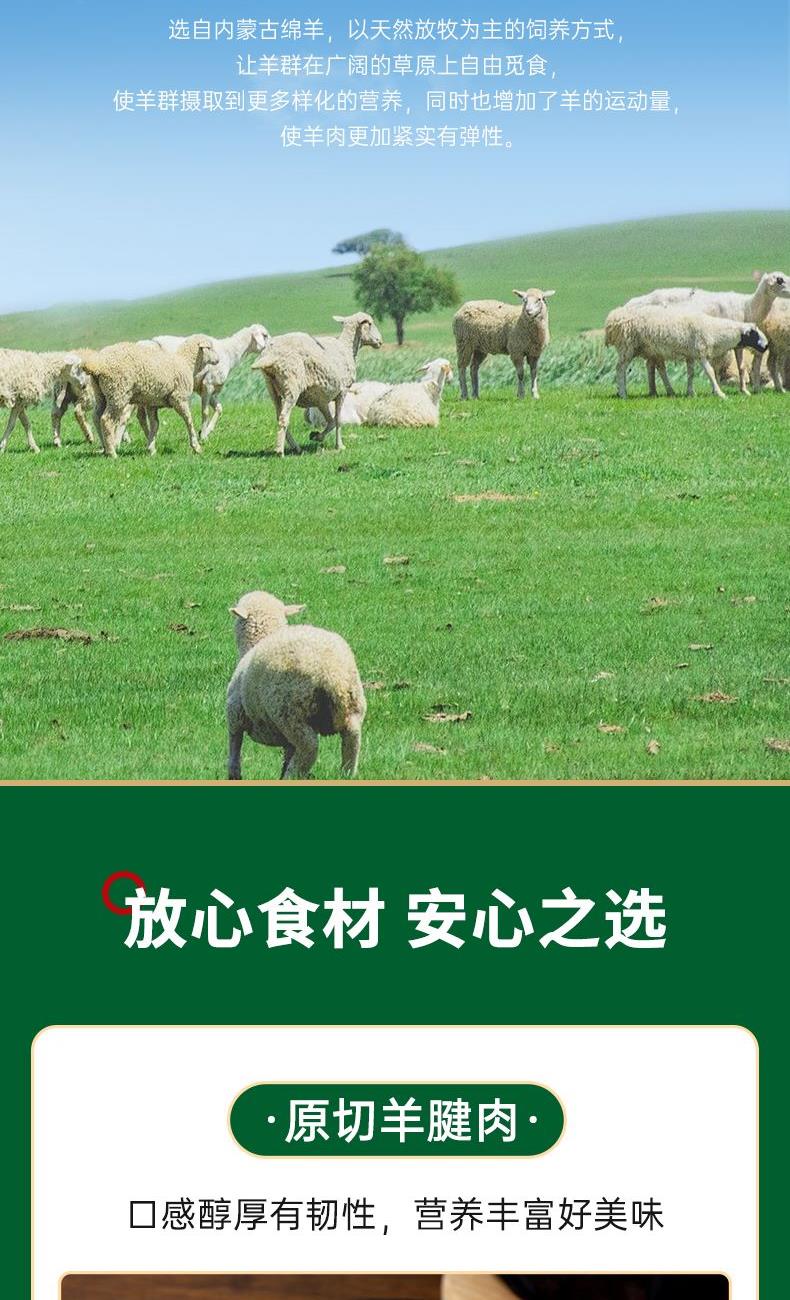 內配內蒙草原原切羊腱肉塊500g 內蒙草原原切羊腱肉塊500g 內蒙草原原切帶骨羊小腿500g 內蒙草原原切羔羊排500g 內蒙草原原切羊蝎子500g*2 賣點:1.禮盒包含了肉、骨,在家也能做出滿滿的美味佳肴。 2.原切肉不添加任何添加劑,食用更放心! 3.禮盒精美承載心意與祝福!