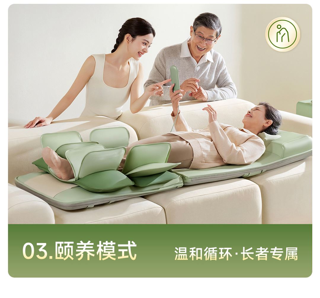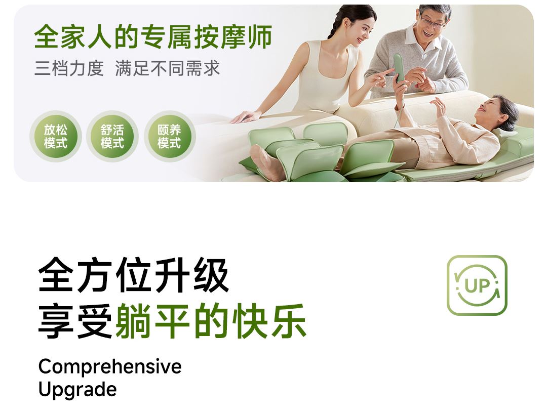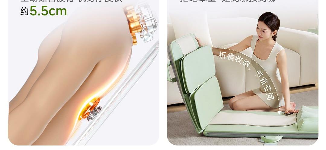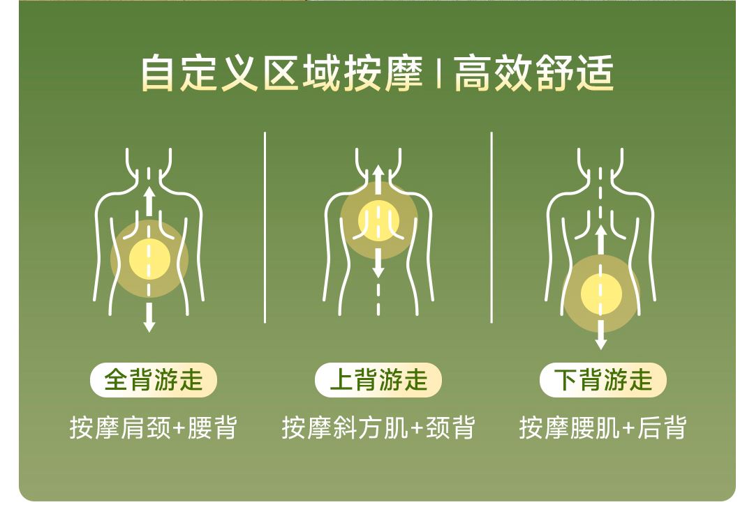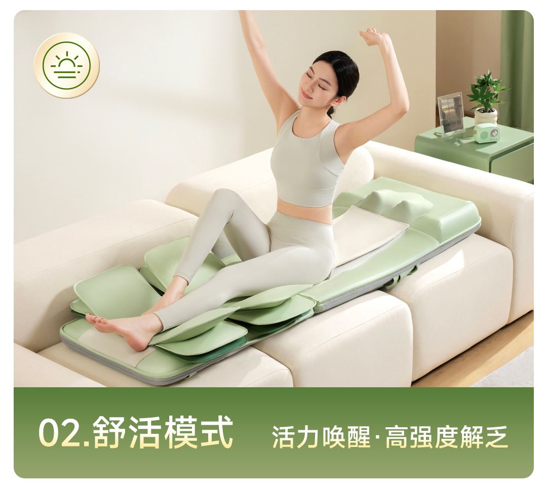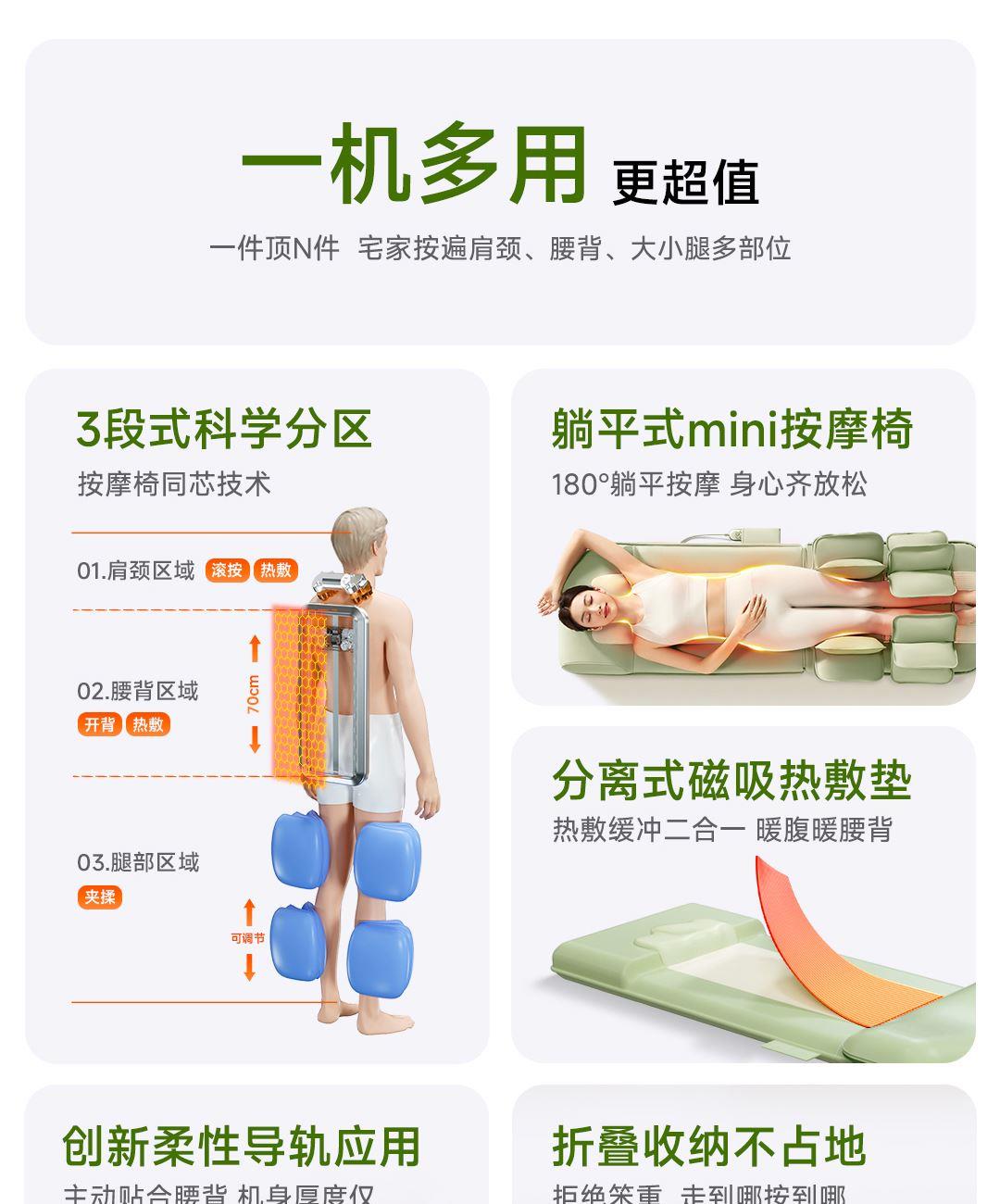 1機多用更超值,宅家按遍肩頸、腰背、大小腿多部位 3段式科學分區(qū),按摩椅同芯技術 躺平式mini按摩椅,180°躺平按摩 身心齊放松 分離式磁吸熱敷墊,熱敷緩沖二合- 暖腹暖腰背 創(chuàng)新柔性導軌應用,主動貼合腰背 機身厚度僅約5.5cm 折疊收納不占地,拒絕笨重 走到哪按到哪 全家人的專屬按摩師,三檔力度模式,滿足不同需求