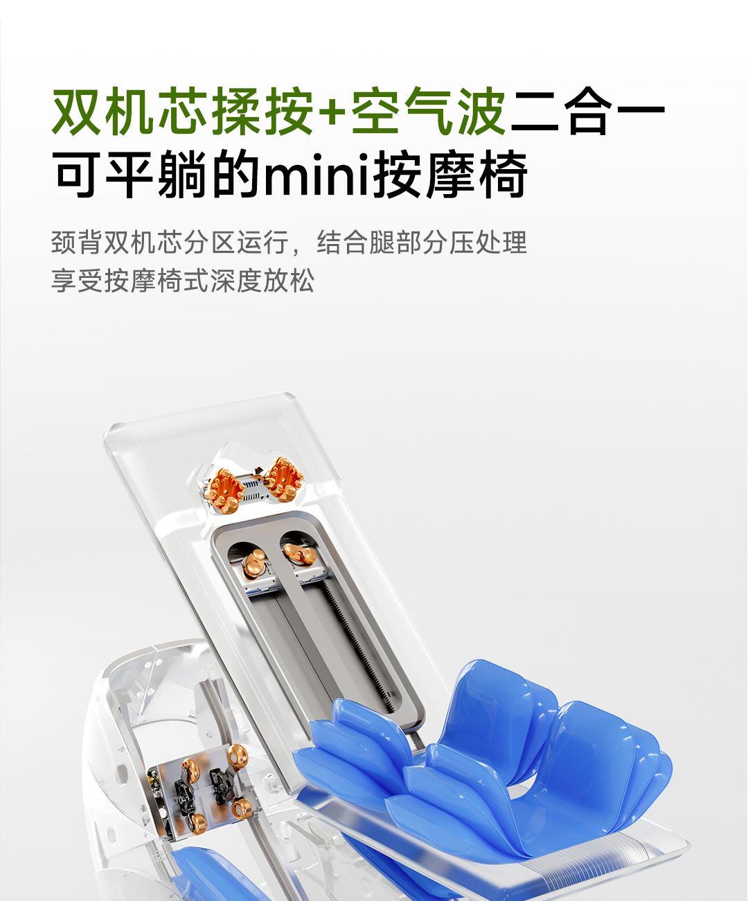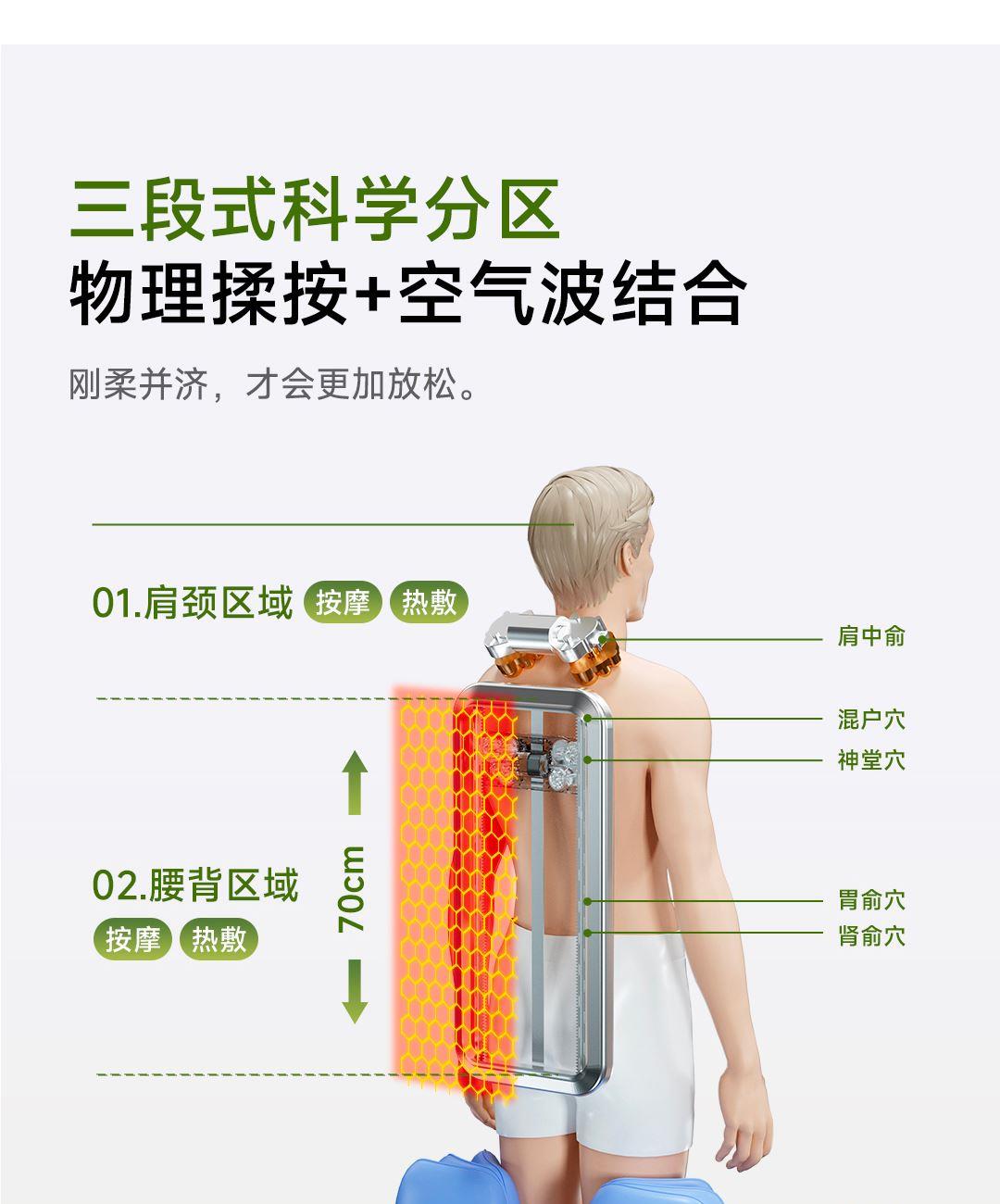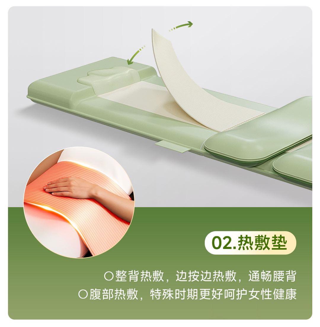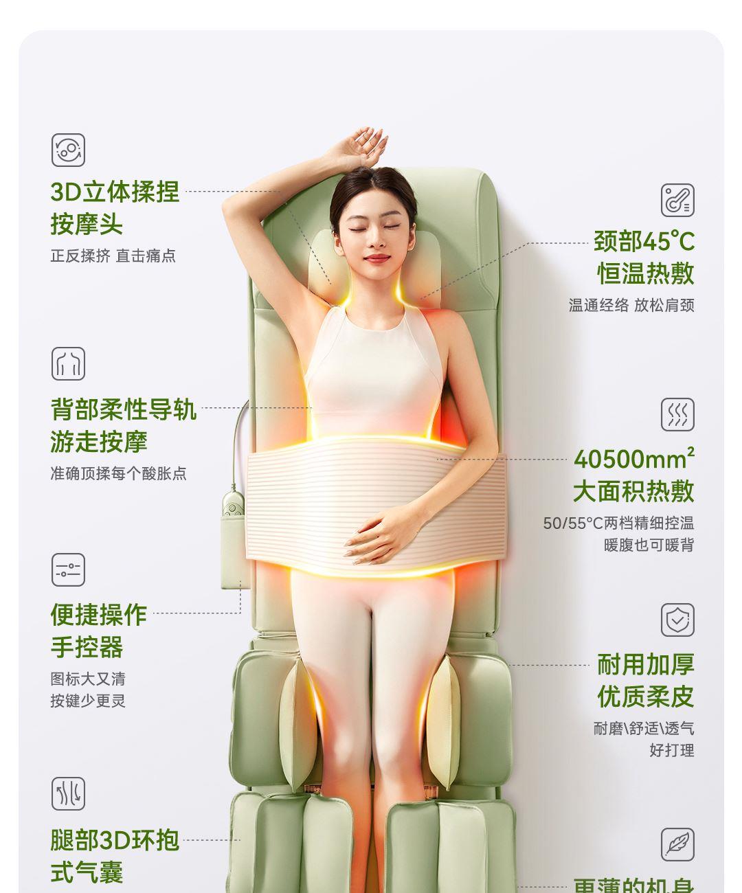 1機多用更超值,宅家按遍肩頸、腰背、大小腿多部位 3段式科學分區(qū),按摩椅同芯技術 躺平式mini按摩椅,180°躺平按摩 身心齊放松 分離式磁吸熱敷墊,熱敷緩沖二合- 暖腹暖腰背 創(chuàng)新柔性導軌應用,主動貼合腰背 機身厚度僅約5.5cm 折疊收納不占地,拒絕笨重 走到哪按到哪 全家人的專屬按摩師,三檔力度模式,滿足不同需求