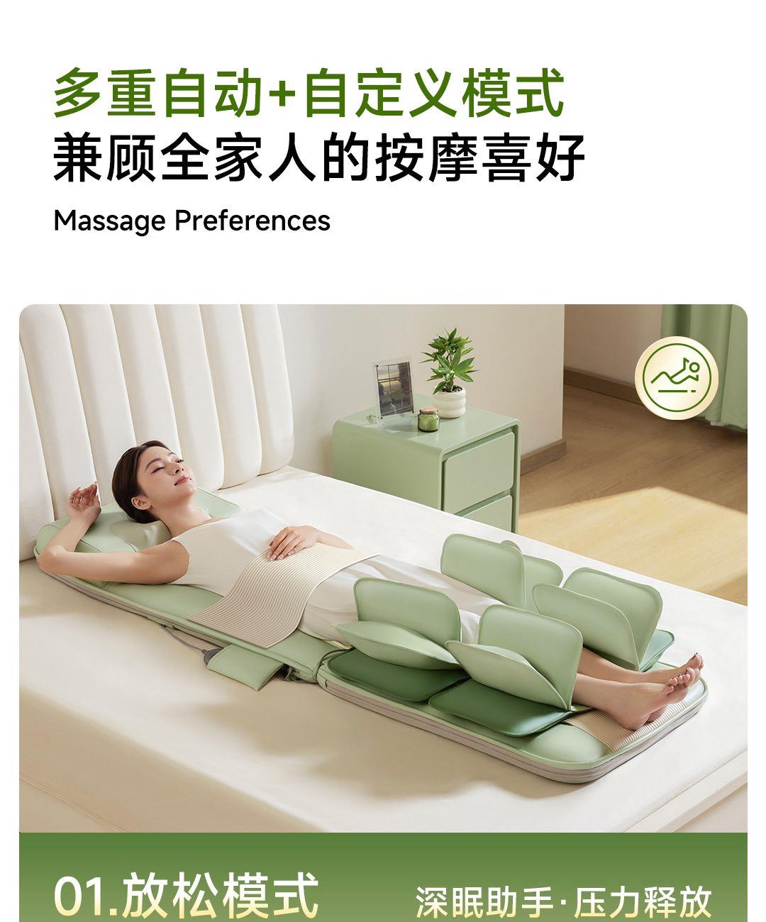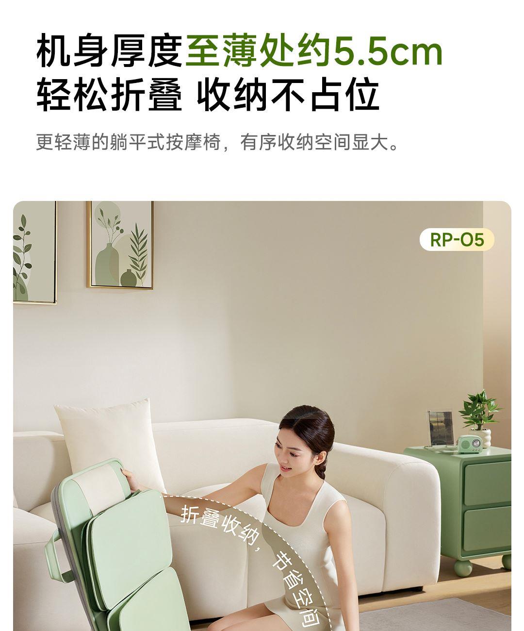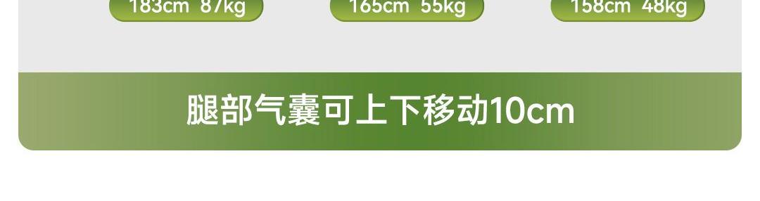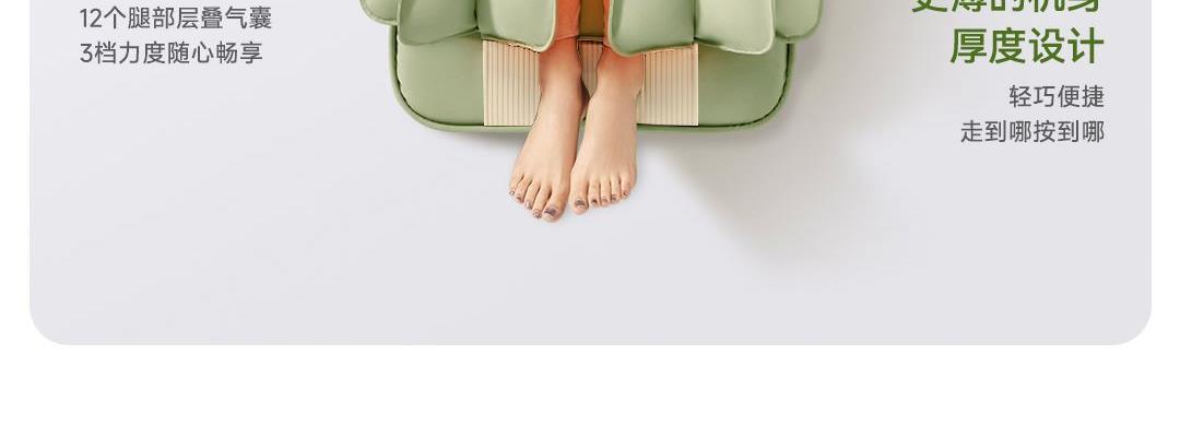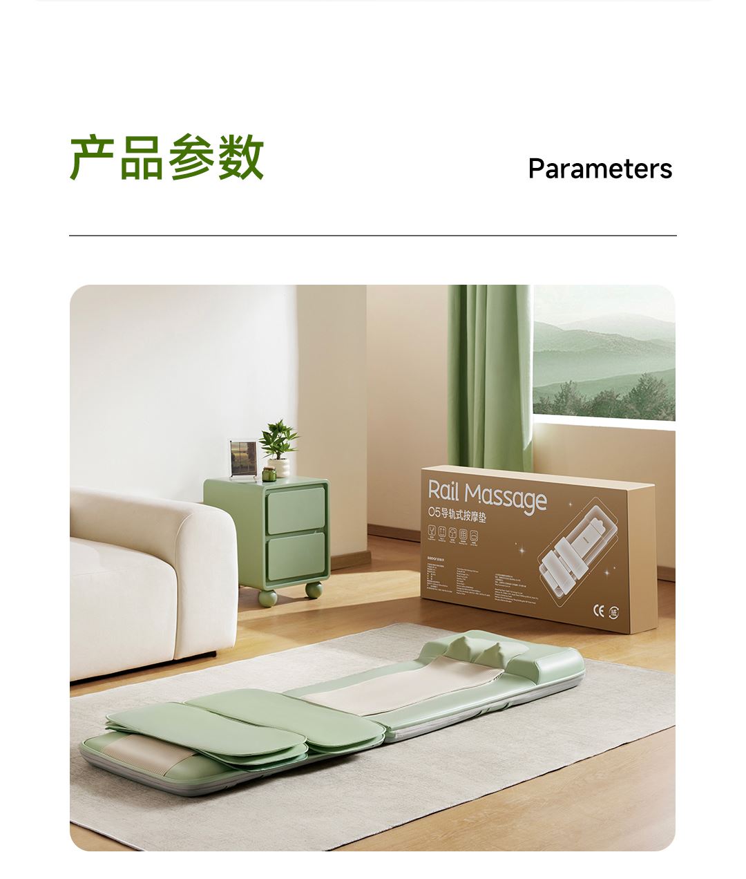 1機多用更超值,宅家按遍肩頸、腰背、大小腿多部位 3段式科學分區(qū),按摩椅同芯技術 躺平式mini按摩椅,180°躺平按摩 身心齊放松 分離式磁吸熱敷墊,熱敷緩沖二合- 暖腹暖腰背 創(chuàng)新柔性導軌應用,主動貼合腰背 機身厚度僅約5.5cm 折疊收納不占地,拒絕笨重 走到哪按到哪 全家人的專屬按摩師,三檔力度模式,滿足不同需求