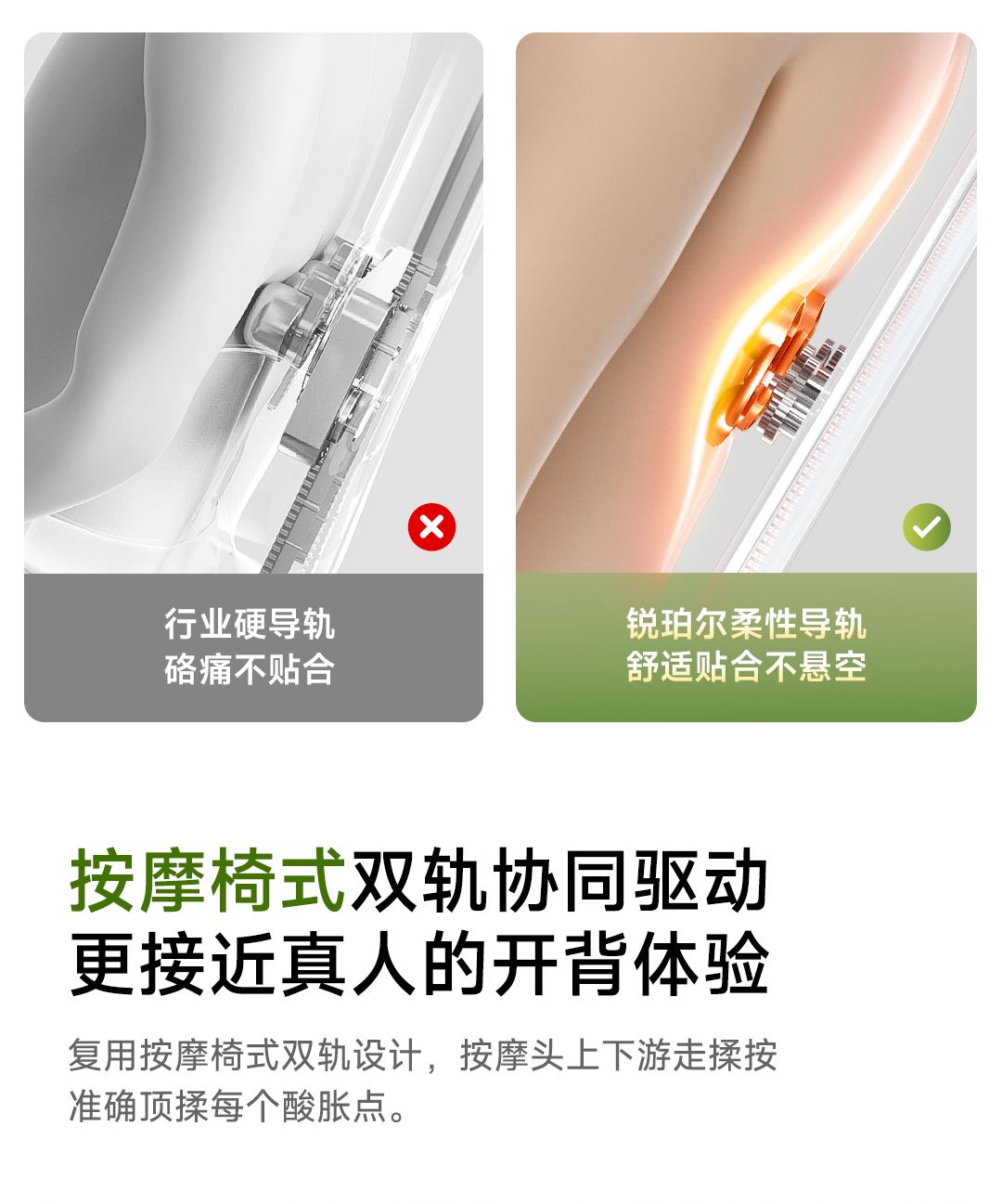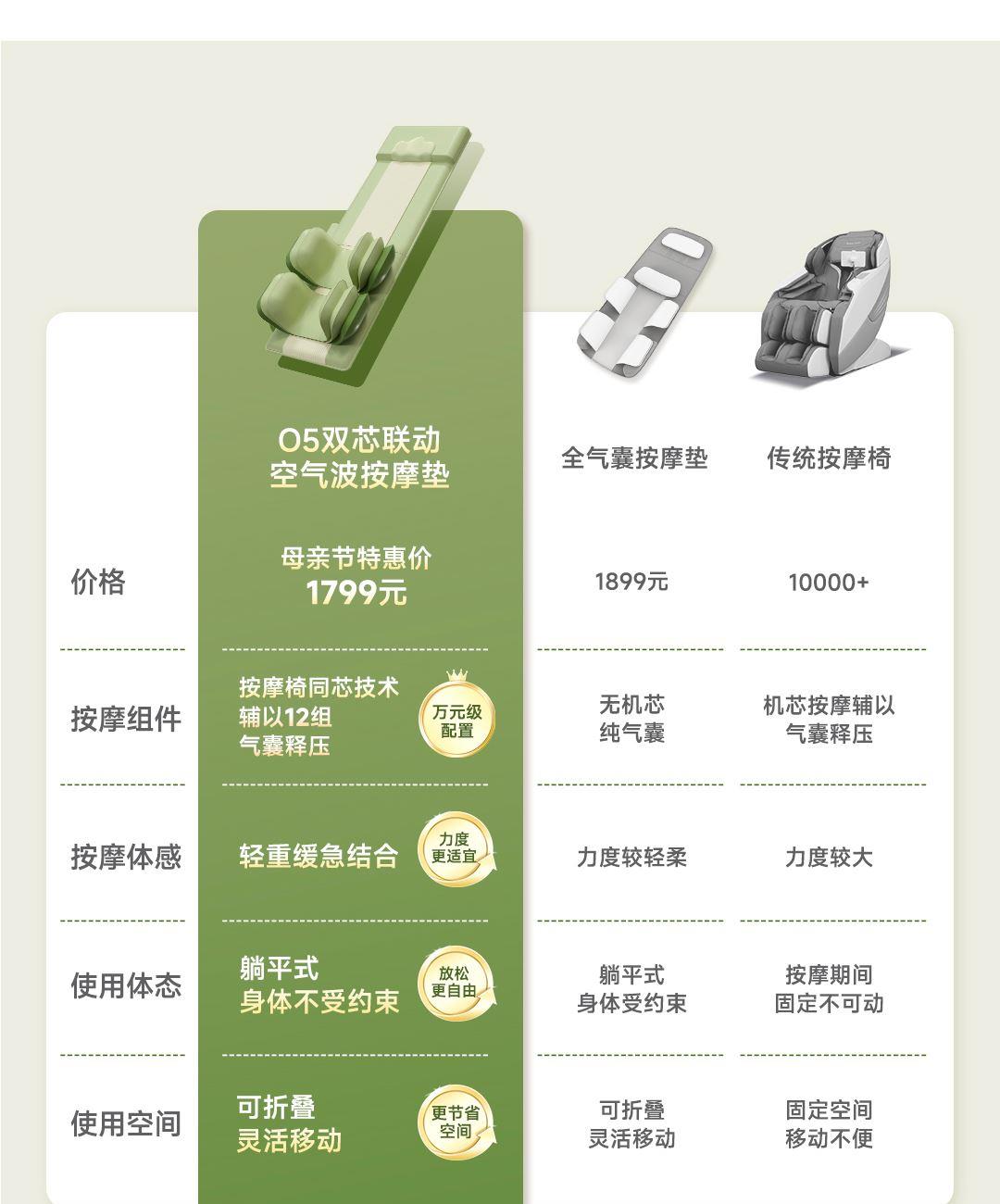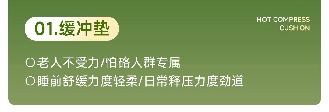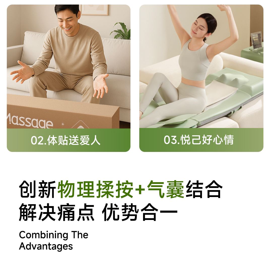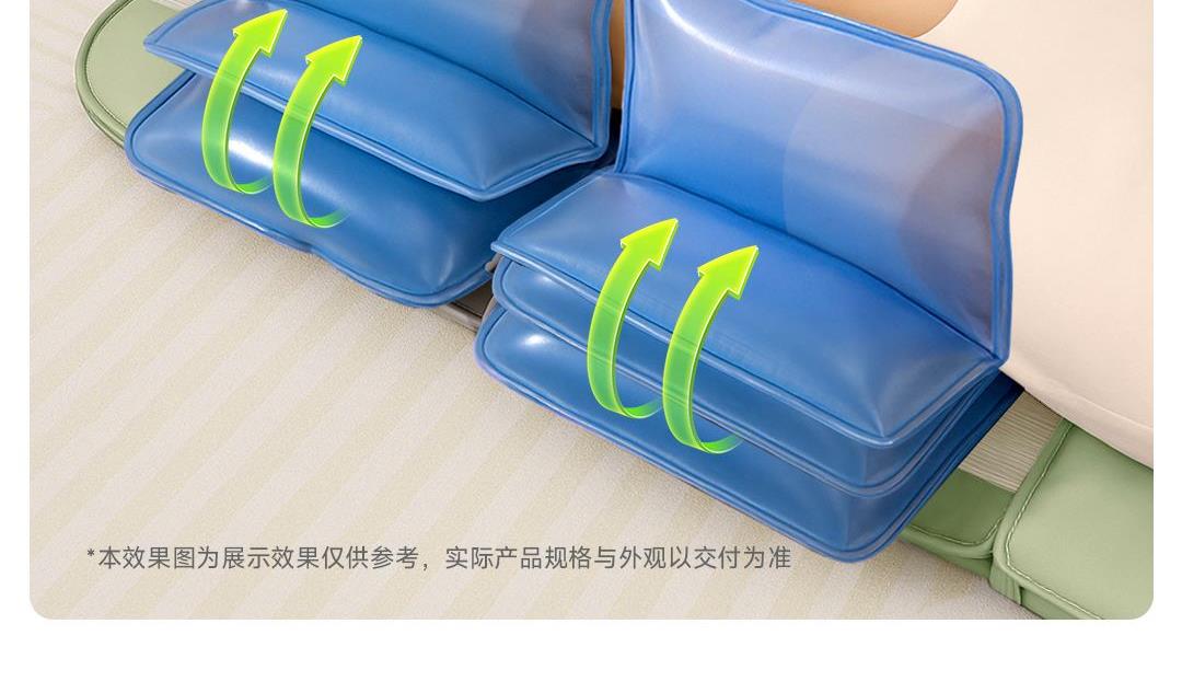 1機多用更超值,宅家按遍肩頸、腰背、大小腿多部位 3段式科學分區(qū),按摩椅同芯技術 躺平式mini按摩椅,180°躺平按摩 身心齊放松 分離式磁吸熱敷墊,熱敷緩沖二合- 暖腹暖腰背 創(chuàng)新柔性導軌應用,主動貼合腰背 機身厚度僅約5.5cm 折疊收納不占地,拒絕笨重 走到哪按到哪 全家人的專屬按摩師,三檔力度模式,滿足不同需求