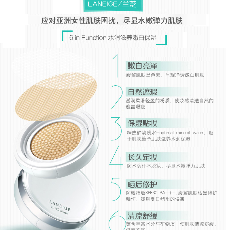 品牌: 蘭芝(LANEIGE) 商品名稱:蘭芝(LANEIGE)氣墊BB霜隔離粉底液遮瑕保濕控油持久 13#亮膚色 商品毛重:200.00g 功效:遮瑕,控油,細致毛孔 類別:氣墊BB 顏色:自然色適合 膚質:任何膚質,干性,中性,敏感性 妝效:自然/裸妝