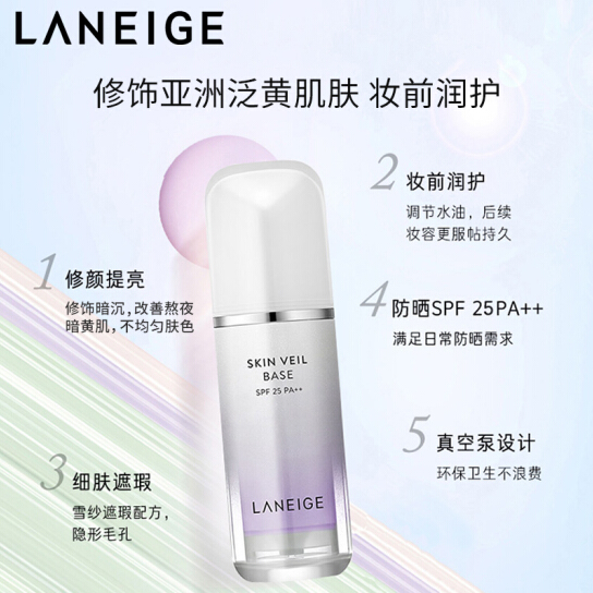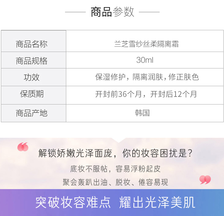 品牌: 蘭芝(LANEIGE) 商品名稱:蘭芝紫隔 商品毛重:160.00g 商品產地:韓國 功效:均勻膚色,提亮膚色,細致毛孔 類別:隔離霜 顏色:紫色 適合膚質:干性,中性,油性,混合性 國產/進口:進口