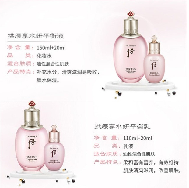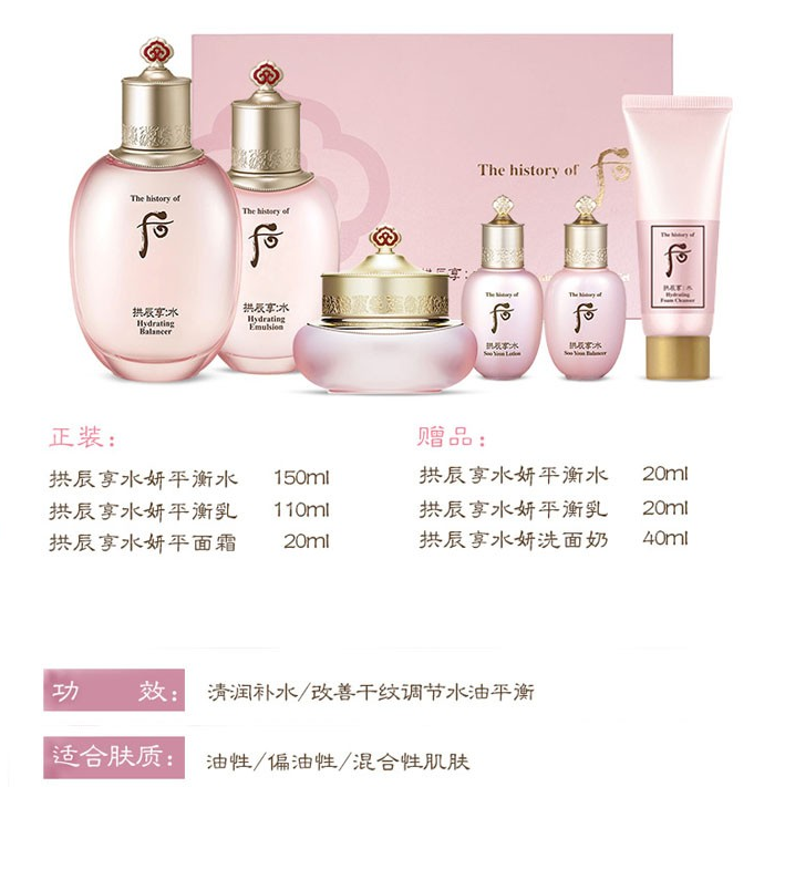 品牌: 后(The history of whoo) 商品名稱:whoo后套裝 拱辰享水妍套裝【補水保濕】 商品毛重:1.0kg 功效:補水,保濕,控油平衡,細致毛孔 適用人群:成人 類別:禮盒裝 適合膚質:任何膚質,干性,油性,混合性 國產/進口:進口