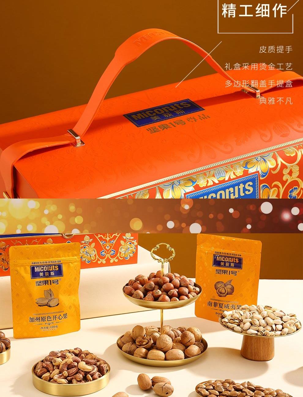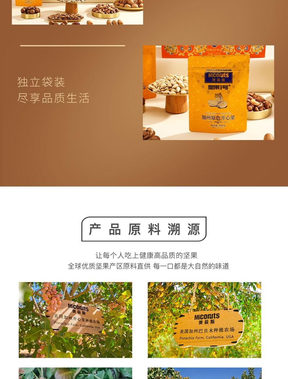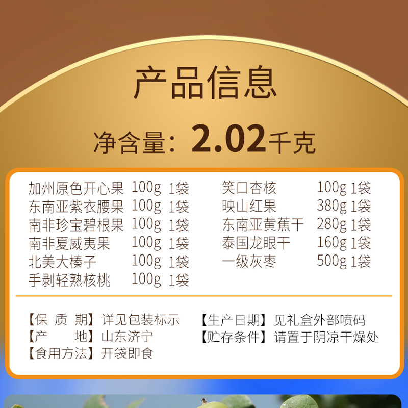 加州原色開心果 100g*1 東南亞紫衣腰果 100g*1 南非珍寶碧根果 100g*1 南非夏威夷果 100g*1 北美大榛子 100g*1 手剝輕熟核桃 100g*1 笑口杏核 100g*1 映山紅果 380g*1 東南亞黃蕉干 280g*1 泰國龍眼干 160g*1 一級灰棗 500g*1 合計:2020g